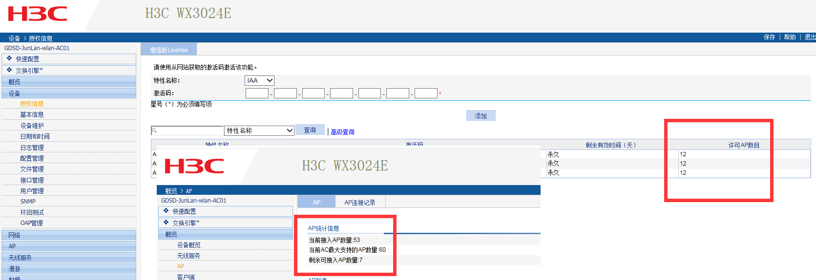 如图所示,许可的AP数目是36,显示最大是60已经接入53。请问下是以哪个数值为准,许可AP数目比接入AP数小会有影响吗?