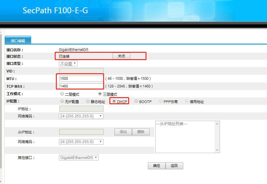 在防火墙的端口配置自动获取,防火墙无法获取到IP地址。配置如下: