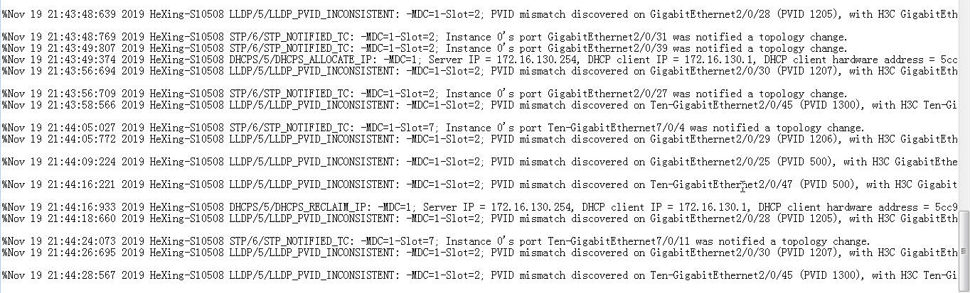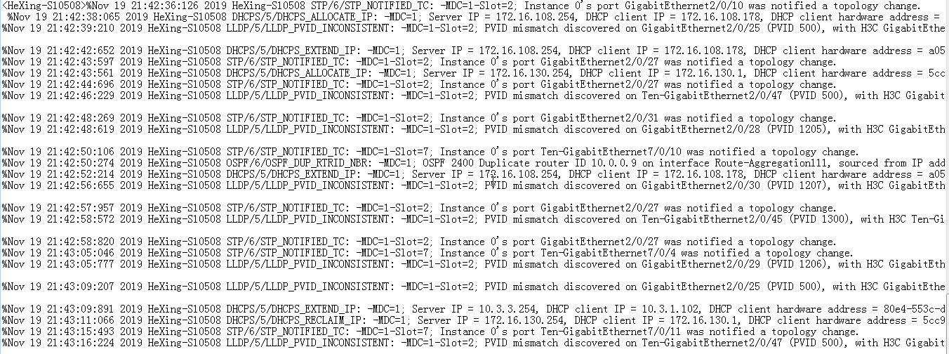 %Nov 19 21:42:38:065 2019 HeXing-S10508 DHCPS/5/DHCPS_ALLOCATE_IP: -MDC=1; Server IP = 172.16.108.254, DHCP client IP = 172.16.108.178, DHCP client hardware address = a057-e373-110b, DHCP client lease = 86400 seconds. %Nov 19 21:42:39:210 2019 HeXing-S10508 LLDP/5/LLDP_PVID_INCONSISTENT: -MDC=1-Slot=2; PVID mismatch discovered on GigabitEthernet2/0/25 (PVID 500), with H3C GigabitEthernet1/0/25 (PVID 1). %Nov 19 21:42:42:652 2019 HeXing-S10508 DHCPS/5/DHCPS_EXTEND_IP: -MDC=1; Server IP = 172.16.108.254, DHCP client IP = 172.16.108.178, DHCP client hardware address = a057-e373-110b, DHCP client lease = 86400 seconds. %Nov 19 21:42:43:597 2019 HeXing-S10508 STP/6/STP_NOTIFIED_TC: -MDC=1-Slot=2; Instance 0's port GigabitEthernet2/0/27 was notified a topology change. %Nov 19 21:42:43:561 2019 HeXing-S10508 DHCPS/5/DHCPS_ALLOCATE_IP: -MDC=1; Server IP = 172.16.130.254, DHCP client IP = 172.16.130.1, DHCP client hardware address = 5cc9-9933-cb2a, DHCP client lease = 86400 seconds. %Nov 19 21:42:44:696 2019 HeXing-S10508 STP/6/STP_NOTIFIED_TC: -MDC=1-Slot=2; Instance 0's port GigabitEthernet2/0/27 was notified a topology change. %Nov 19 21:42:46:229 2019 HeXing-S10508 LLDP/5/LLDP_PVID_INCONSISTENT: -MDC=1-Slot=2; PVID mismatch discovered on Ten-GigabitEthernet2/0/47 (PVID 500), with H3C GigabitEthernet1/0/25 (PVID 1). %Nov 19 21:42:48:269 2019 HeXing-S10508 STP/6/STP_NOTIFIED_TC: -MDC=1-Slot=2; Instance 0's port GigabitEthernet2/0/31 was notified a topology change. %Nov 19 21:42:48:619 2019 HeXing-S10508 LLDP/5/LLDP_PVID_INCONSISTENT: -MDC=1-Slot=2; PVID mismatch discovered on GigabitEthernet2/0/28 (PVID 1205), with H3C GigabitEthernet1/0/25 (PVID 1). %Nov 19 21:42:50:106 2019 HeXing-S10508 STP/6/STP_NOTIFIED_TC: -MDC=1-Slot=7; Instance 0's port Ten-GigabitEthernet7/0/10 was notified a topology change. %Nov 19 21:42:50:274 2019 HeXing-S10508 OSPF/6/OSPF_DUP_RTRID_NBR: -MDC=1; OSPF 2400 Duplicate router ID 10.0.0.9 on interface Route-Aggregation111, sourced from IP address 10.0.0.9. %Nov 19 21:42:52:214 2019 HeXing-S10508 DHCPS/5/DHCPS_EXTEND_IP: -MDC=1; Server IP = 172.16.108.254, DHCP client IP = 172.16.108.178, DHCP client hardware address = a057-e373-110b, DHCP client lease = 86400 seconds. %Nov 19 21:42:56:655 2019 HeXing-S10508 LLDP/5/LLDP_PVID_INCONSISTENT: -MDC=1-Slot=2; PVID mismatch discovered on GigabitEthernet2/0/30 (PVID 1207), with H3C GigabitEthernet1/0/25 (PVID 1). %Nov 19 21:42:57:957 2019 HeXing-S10508 STP/6/STP_NOTIFIED_TC: -MDC=1-Slot=2; Instance 0's port GigabitEthernet2/0/27 was notified a topology change. %Nov 19 21:42:58:572 2019 HeXing-S10508 LLDP/5/LLDP_PVID_INCONSISTENT: -MDC=1-Slot=2; PVID mismatch discovered on Ten-GigabitEthernet2/0/45 (PVID 1300), with H3C Ten-GigabitEthernet1/0/49 (PVID 1). %Nov 19 21:42:58:820 2019 HeXing-S10508 STP/6/STP_NOTIFIED_TC: -MDC=1-Slot=2; Instance 0's port GigabitEthernet2/0/27 was notified a topology change. %Nov 19 21:43:05:046 2019 HeXing-S10508 STP/6/STP_NOTIFIED_TC: -MDC=1-Slot=7; Instance 0's port Ten-GigabitEthernet7/0/4 was notified a topology change. %Nov 19 21:43:05:777 2019 HeXing-S10508 LLDP/5/LLDP_PVID_INCONSISTENT: -MDC=1-Slot=2; PVID mismatch discovered on GigabitEthernet2/0/29 (PVID 1206), with H3C GigabitEthernet1/0/25 (PVID 1). %Nov 19 21:43:09:207 2019 HeXing-S10508 LLDP/5/LLDP_PVID_INCONSISTENT: -MDC=1-Slot=2; PVID mismatch discovered on GigabitEthernet2/0/25 (PVID 500), with H3C GigabitEthernet1/0/25 (PVID 1). %Nov 19 21:43:09:891 2019 HeXing-S10508 DHCPS/5/DHCPS_EXTEND_IP: -MDC=1; Server IP = 10.3.3.254, DHCP client IP = 10.3.1.102, DHCP client hardware address = 80e4-553c-dbc0, DHCP client lease = 86400 seconds. %Nov 19 21:43:11:066 2019 HeXing-S10508 DHCPS/5/DHCPS_RECLAIM_IP: -MDC=1; Server IP = 172.16.130.254, DHCP client IP = 172.16.130.1, DHCP client hardware address = 5cc9-9933-cb2a, DHCP client lease = 86400 seconds. %Nov 19 21:43:15:493 2019 HeXing-S10508 STP/6/STP_NOTIFIED_TC: -MDC=1-Slot=7; Instance 0's port Ten-GigabitEthernet7/0/11 was notified a topology change. %Nov 19 21:43:16:224 2019 HeXing-S10508 LLDP/5/LLDP_PVID_INCONSISTENT: -MDC=1-Slot=2; PVID mismatch discovered on Ten-GigabitEthernet2/0/47 (PVID 500), with H3C GigabitEthernet1/0/25 (PVID 1). %Nov 19 21:43:18:618 2019 HeXing-S10508 LLDP/5/LLDP_PVID_INCONSISTENT: -MDC=1-Slot=2; PVID mismatch discovered on GigabitEthernet2/0/28 (PVID 1205), with H3C GigabitEthernet1/0/25 (PVID 1). %Nov 19 21:43:26:658 2019 HeXing-S10508 LLDP/5/LLDP_PVID_INCONSISTENT: -MDC=1-Slot=2; PVID mismatch discovered on GigabitEthernet2/0/30 (PVID 1207), with H3C GigabitEthernet1/0/25 (PVID 1). %Nov 19 21:43:28:569 2019 HeXing-S10508 LLDP/5/LLDP_PVID_INCONSISTENT: -MDC=1-Slot=2; PVID mismatch discovered on Ten-GigabitEthernet2/0/45 (PVID 1300), with H3C Ten-GigabitEthernet1/0/49 (PVID 1). %Nov 19 21:43:31:855 2019 HeXing-S10508 STP/6/STP_NOTIFIED_TC: -MDC=1-Slot=7; Instance 0's port Ten-GigabitEthernet7/0/10 was notified a topology change. %Nov 19 21:43:35:772 2019 HeXing-S10508 LLDP/5/LLDP_PVID_INCONSISTENT: -MDC=1-Slot=2; PVID mismatch discovered on GigabitEthernet2/0/29 (PVID 1206), with H3C GigabitEthernet1/0/25 (PVID 1). %Nov 19 21:43:39:208 2019 HeXing-S10508 LLDP/5/LLDP_PVID_INCONSISTENT: -MDC=1-Slot=2; PVID mismatch discovered on GigabitEthernet2/0/25 (PVID 500), with H3C GigabitEthernet1/0/25 (PVID 1). %Nov 19 21:43:44:599 2019 HeXing-S10508 STP/6/STP_NOTIFIED_TC: -MDC=1-Slot=2; Instance 0's port GigabitEthernet2/0/27 was notified a topology change. %Nov 19 21:43:45:309 2019 HeXing-S10508 STP/6/STP_NOTIFIED_TC: -MDC=1-Slot=2; Instance 0's port GigabitEthernet2/0/27 was notified a topology change. %Nov 19 21:43:46:221 2019 HeXing-S10508 LLDP/5/LLDP_PVID_INCONSISTENT: -MDC=1-Slot=2; PVID mismatch discovered on Ten-GigabitEthernet2/0/47 (PVID 500), with H3C GigabitEthernet1/0/25 (PVID 1). %Nov 19 21:43:48:639 2019 HeXing-S10508 LLDP/5/LLDP_PVID_INCONSISTENT: -MDC=1-Slot=2; PVID mismatch discovered on GigabitEthernet2/0/28 (PVID 1205), with H3C GigabitEthernet1/0/25 (