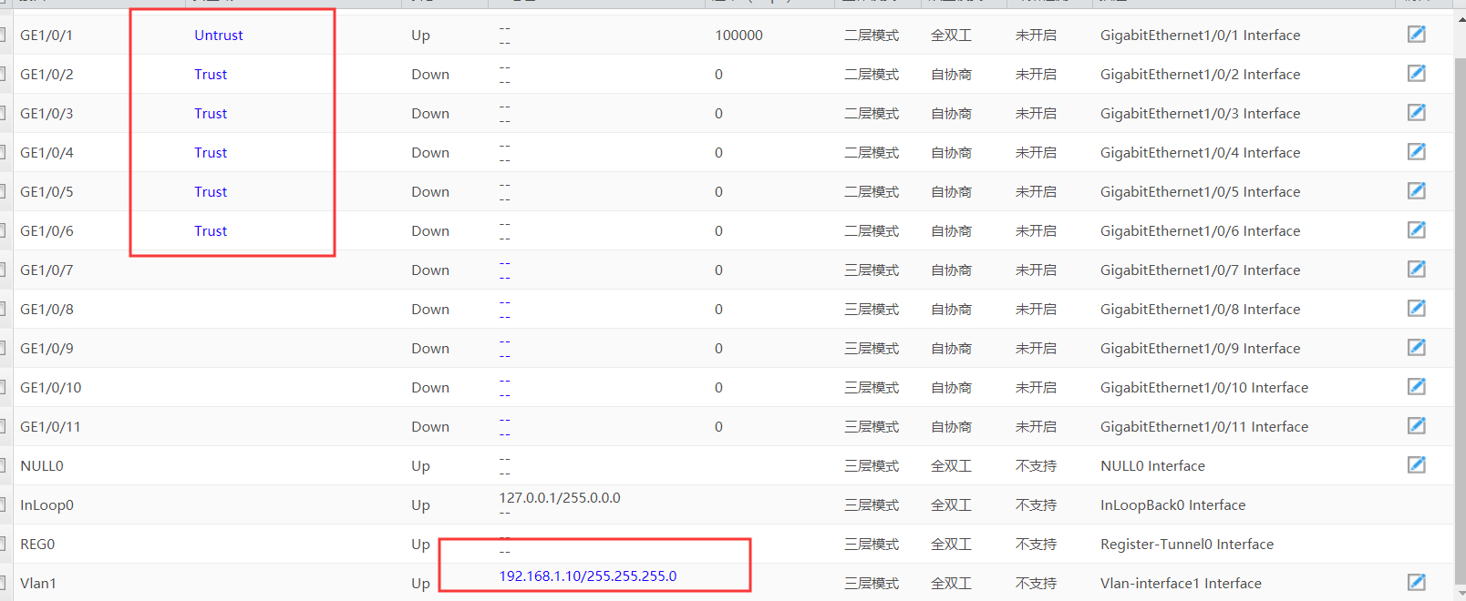 现在把防火墙架上去以后,设定的防火墙管理地址192.168.1.10获取不到。。但是下面的设备IP都能正常获取,正常上网