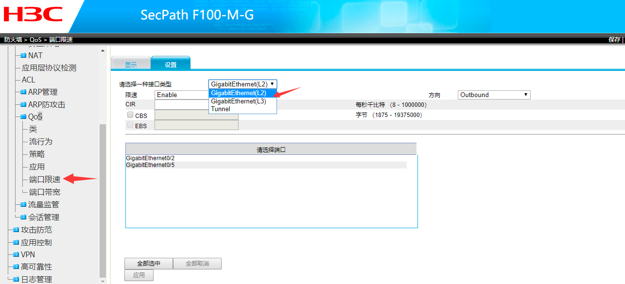 如下图,防火墙配置里面,请选择一种接口类型,这里面为什么只有两个网卡接口,为什么没有L1接口和L0接口?L1是外网口,L3是内网口。目前想对外网进行上传、下载限速。请问通过web怎么实现?
