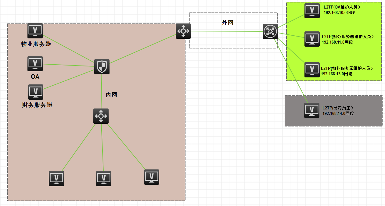 公司有一内网,有服务器若干台,比如OA,财务等服务器,有时候需要对厂家的人需要对OA,财务等服务器进行维护,就给厂家的人一个L2TP的帐号拔进内网,然后对服务器远程桌面进行维护工作,现在的问题就是OA厂家的使用L2TP拔进内网后,可以随意访问任意一台服务器