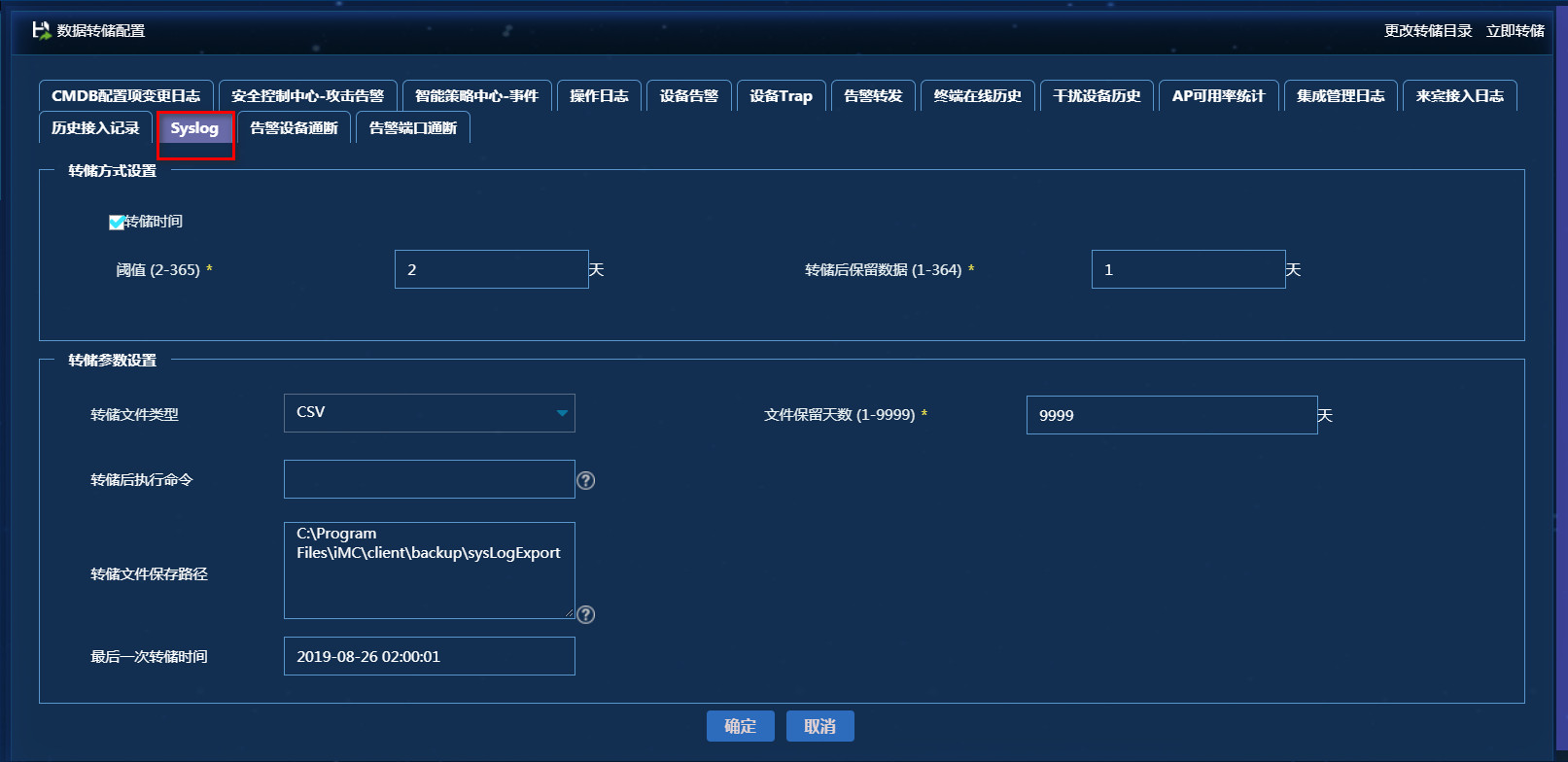 IMC 5.0 system data export setting syslog 这里无法更改保存log的target file path ?可能不是在这里更改?在哪更改? Syslog 原来log 是压缩档zip的,现在突然成了csv文档了,占的空间太大了,怎么样才能改回原来的zip档?