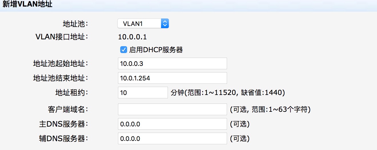 路由器默认地址10.0.0.1 掩码:255.255.0.0 默认vlan1