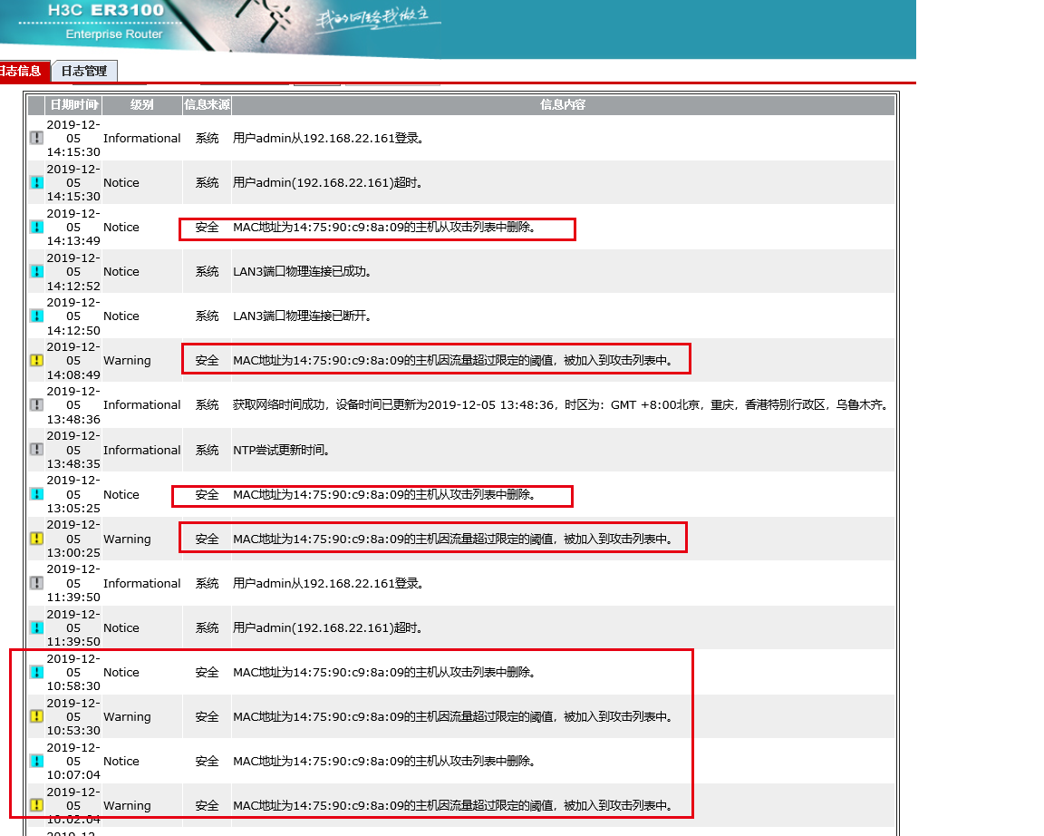 h3c er3100 近日出现几次“MAC地址为14:75:90:c9:8a:09的主机因流量超过限定的阈值,被加入到攻击列表中”故障,导致网络中断。
