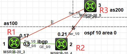 要求是这样子的 为了当值本路由域内始发路由再被引回到本路由域,从而造成环路,规划在BGP引入路由到ospf时使用route-policy来进行过滤,具体要求如下: 采用给引入后路由打标签(标签值为100)的方式来实现; route-policy名称为bgp2ospf,node编号10和20 选路部署 主链路R1-R3 备份链路R2-R3 使用route-policy改变路由(192.0.0.0/16聚合后的内网路由)MED属性,且MED值必须为100或200 route-policy 使用ACL 2020 rule值为0 改变引入路由的cost值5或10,类型为Type 2 route-policy名称为bgp2ospf 节点编号为10 和20 所以只说要打100的标 多打不就不对嘛 ospf引入bgp的时候不能直接打标啊 如果用route-policy打标的话bgp引入到ospf时就不能再用route-policy来拒绝 所以我就好晕了呀