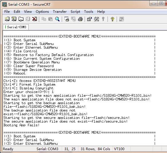 检查显示文字提示“应用文件不存在”,所以就到华三官网下载了【S1824G-CMW520-R1105版本软件】,尝试用来刷程序进去。但效果没变化。