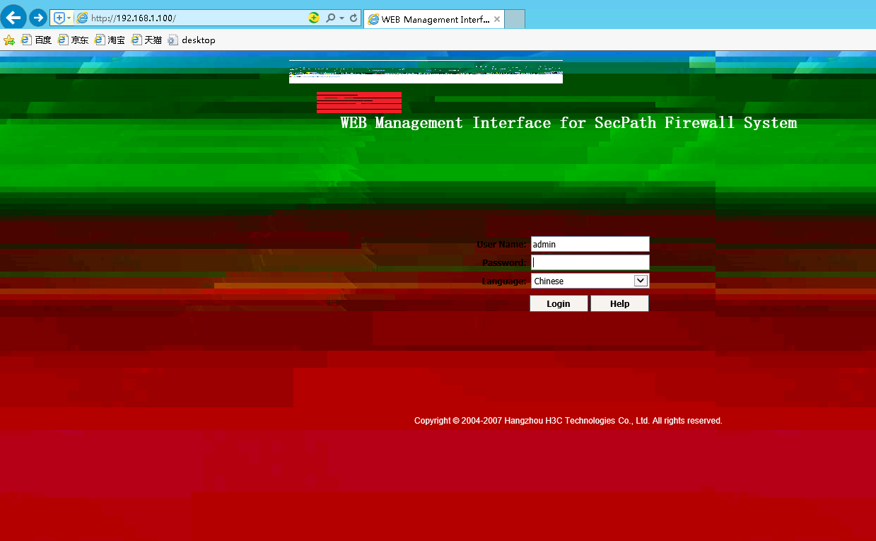 F100-S防火墙不能WEB登陆,登陆后无反应,防火墙登录界面背景图和正常的不一样,换过浏览器、清理过缓存,重启过电脑都不行 如下图: