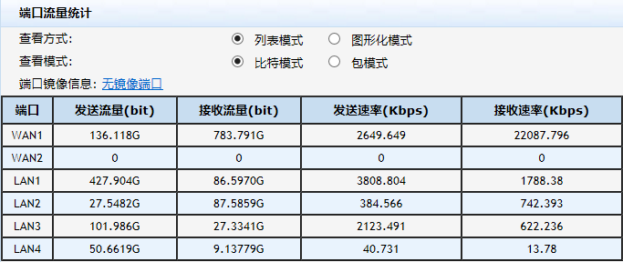 请问wan1口的接收速率22087.796是怎么计算出来的,我看LAN1到LAN4端口合计加起来才3166.789,。wan1的发送速率也不是LAN1到LAN4发送速率的合计。外网就wan1一条线路,通过3260分出来LAN1到LAN4四条内网,没有vlan,很简单的网络结构。