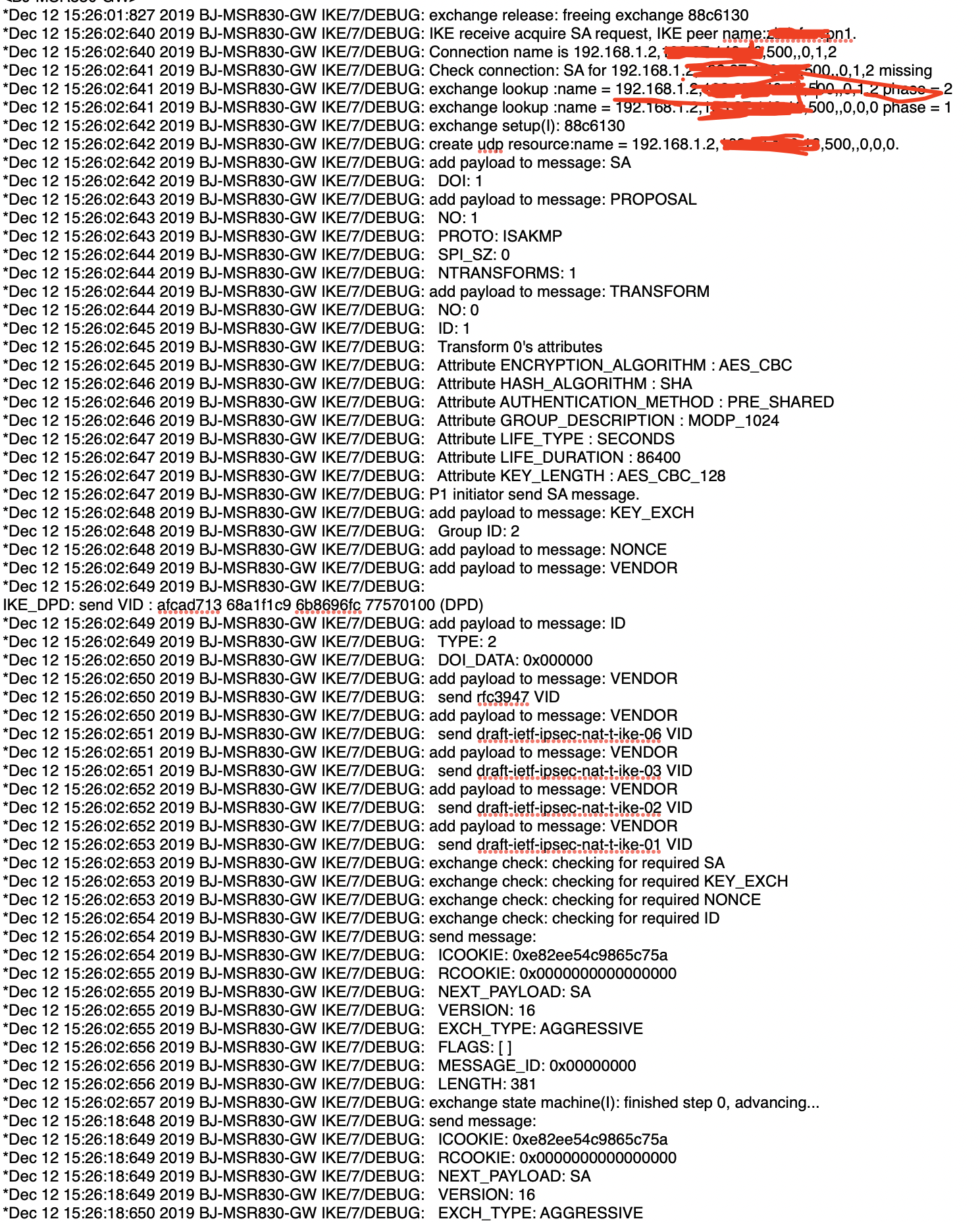 2.另外1台,刚建立起来是好的,运行2周后,ike,ipsec建立不起来了。中心端和830上没有任何操作。下面是ike debug 信息
