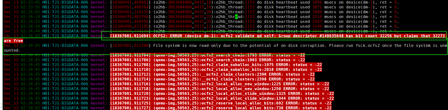 Dec 13 02:34:45 HB1-TJ1-BIGDATA-006 kernel: [18367001.911700] File system is now read-only due to the potential of on-disk corruption. Please run fsck.ocfs2 once the file system is unmounted