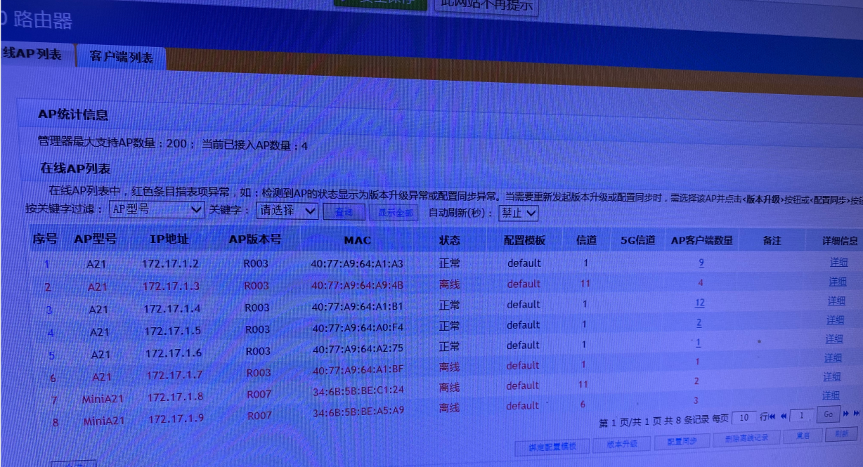 AP A21能上线 但是过一段时间会自己掉线 再过一会有上线 掉线的AP不是固定的那几个是都掉 跳线都是成品线测过没问题GR3200就改了网关192.168.8.1,其他都是默认的网络拓扑:GR3200——傻瓜POE交换机——AP