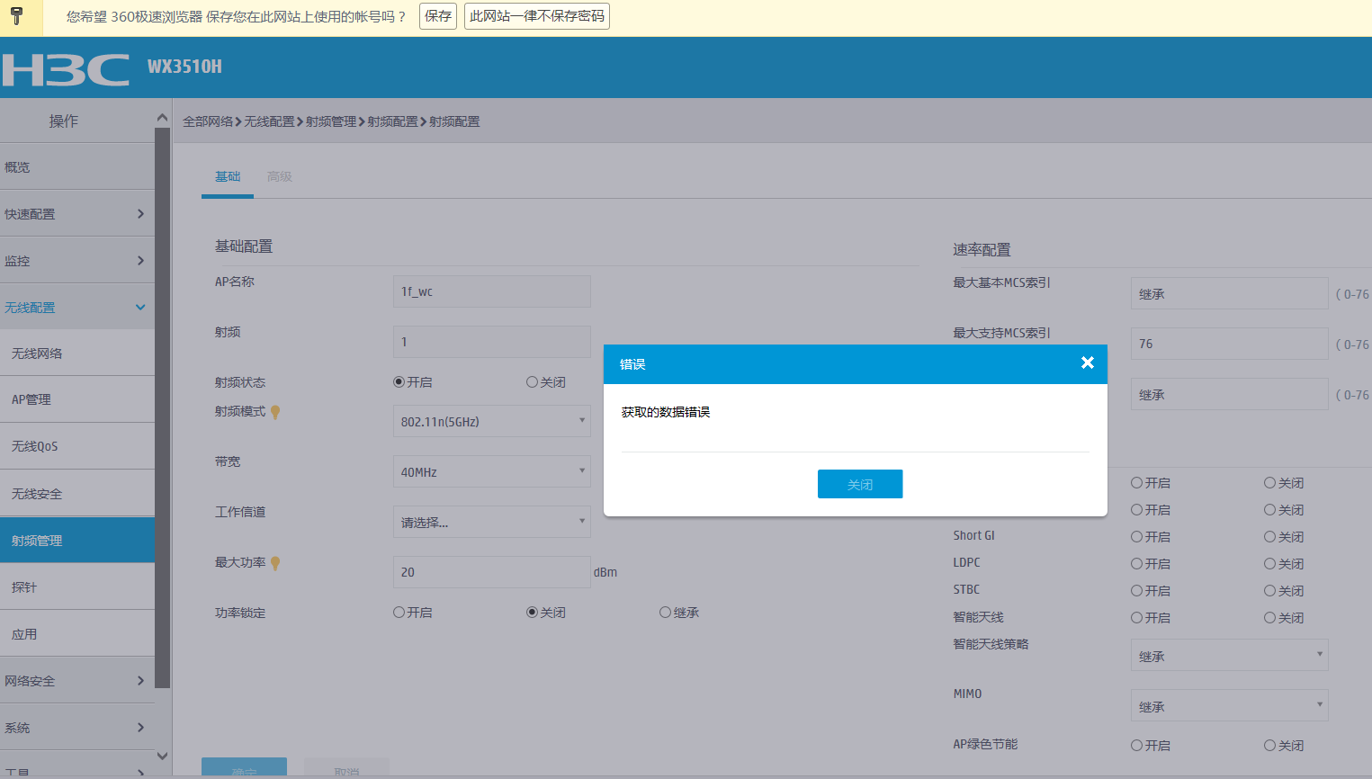 AC(WX3510H)软件版本升级到5426P02后打开射频配置报错