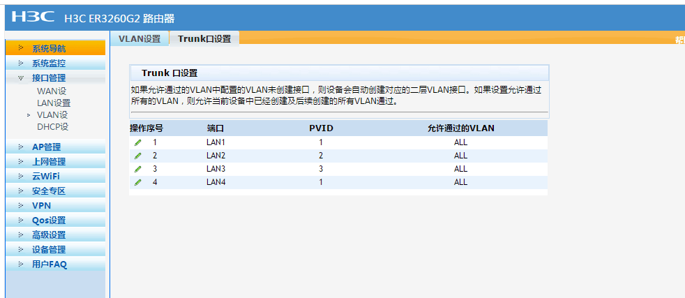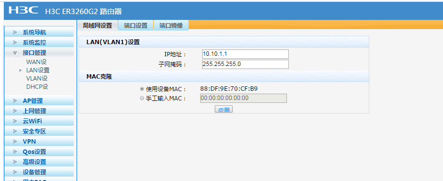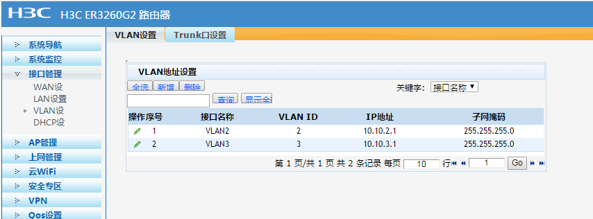 er3260 默认vlan1,设置10.10.1.1网段,添加vlan2 地址 10.0.2.1网段。