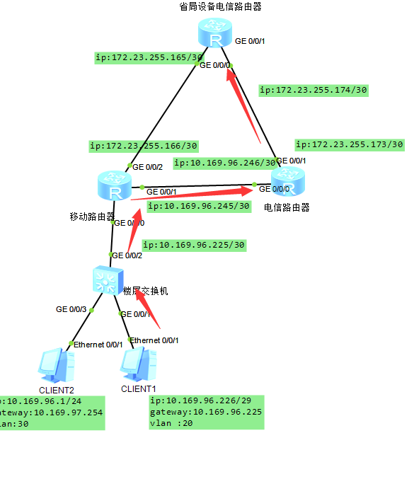 想将client1 PC电脑的网段按照图中红色路径执行,我对移动路由器做了一个策略路由,指定10.169.96.224/29网段的IP下一跳为移动路由器的1接口,还是不行。