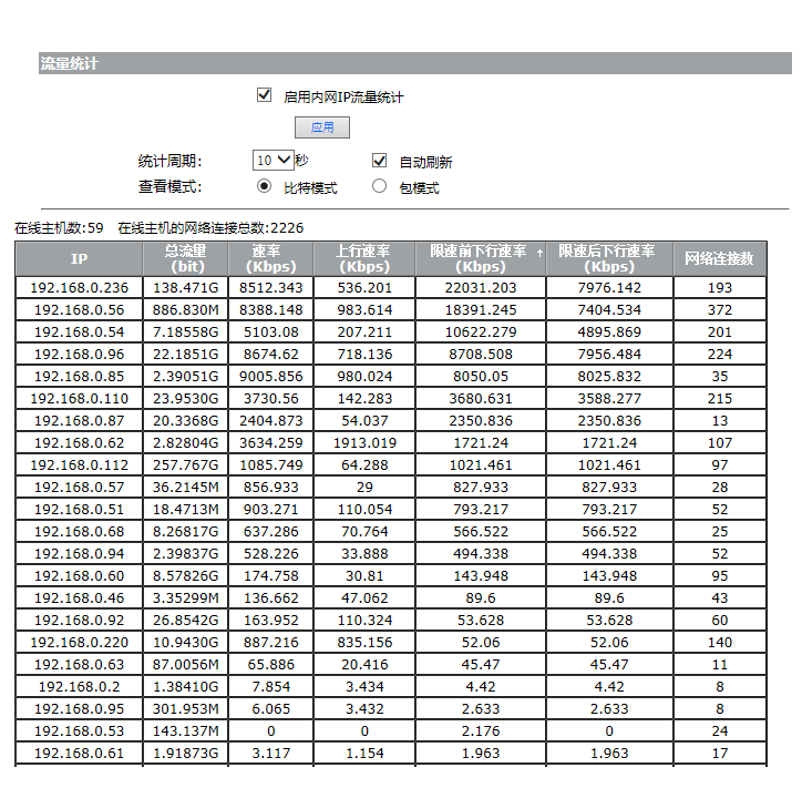 故障现象: 流量监控表中显示限速后的速率为7976,但在网络中实际的速率为22031,限速后7976+7404+4895+7956+8025+3588+2350+1721+1021=44936,限速前22031+18391+10622+8708+8050+3680+2350+1721+1021=76574,基本符合wan口流量图。经过人工筛选和查找由爱奇艺引起,所以本人(IP为236)就用爱奇艺进行测试,测试本机电脑网络的确被限制。但由于wan口带宽被占用满了,导致整个网络延迟严重,甚至无法连接。