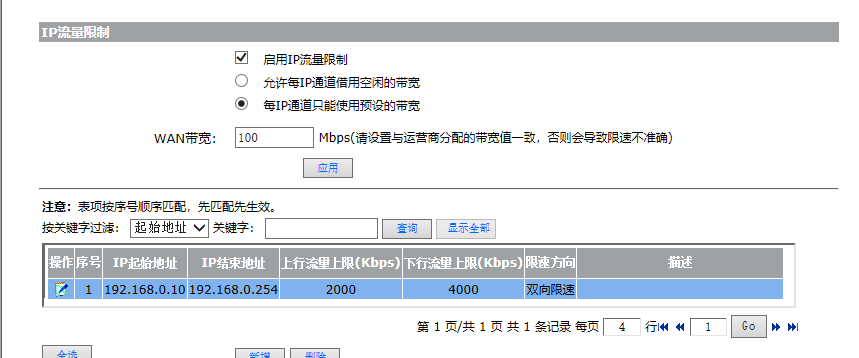 每IP通道只能使用预设的带宽(独占),上行流量上限(kbps)4000,下行流量上限(kbps)8000,双向限速。
