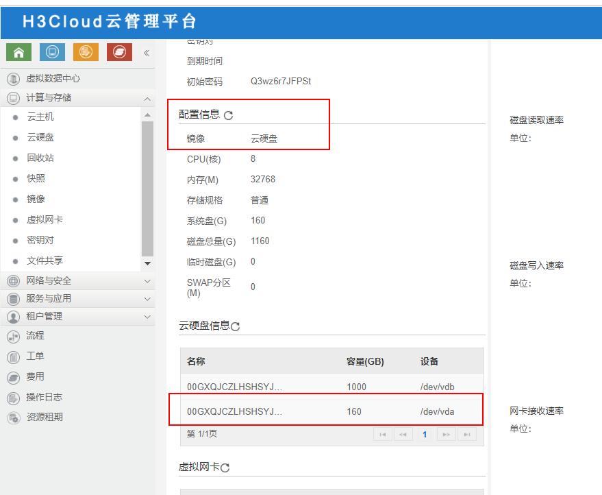 CloudOS下发虚拟机,系统为Ubuntu 16.04.6 LTS,系统盘160G下发后,CAS云平台显示有160G系统盘,但是在CloudOS界面不显示系统盘?(最后一幅图为正常虚拟机在云硬盘显示系统盘)