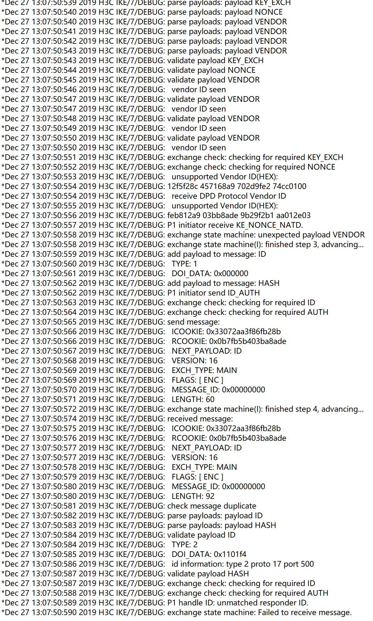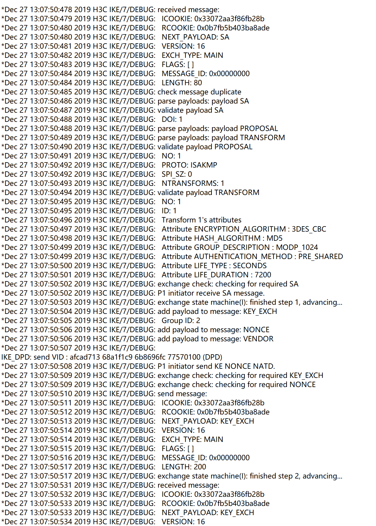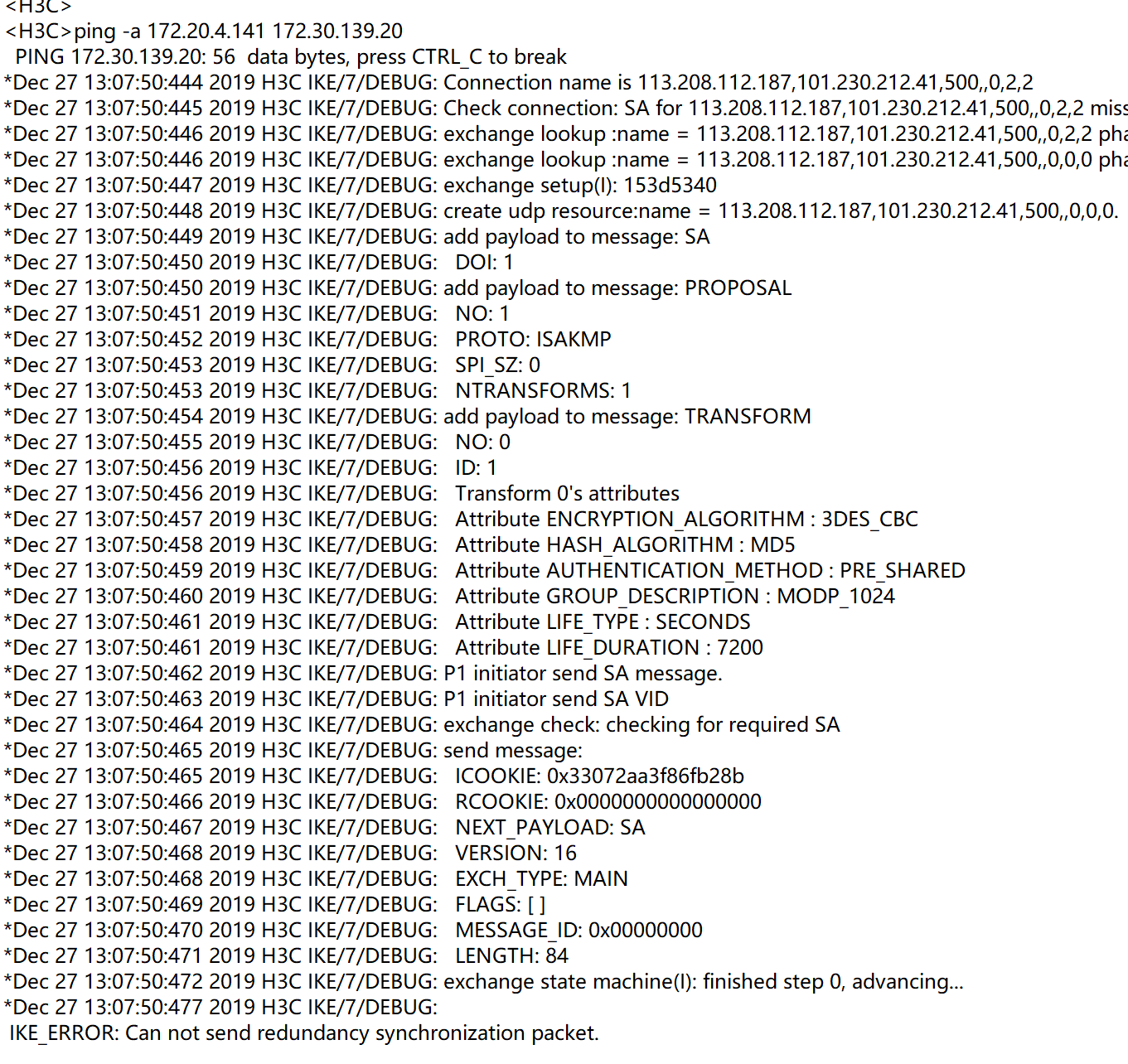 h3c防火墙无法建立ipsec,开了debug帮忙看下是哪里有问题