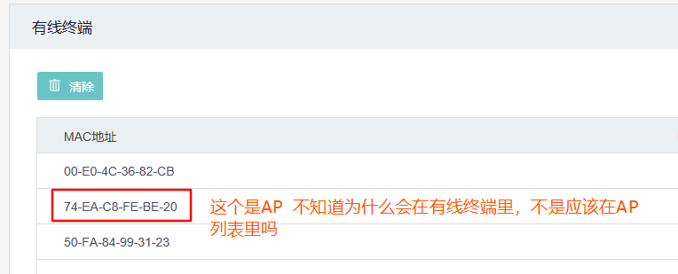 这款注册的时间很慢要15分钟到20分钟。估计是时间没到,也有可能您的AP是胖模式,AP本身对AC来说是一个有线终端。所以在有线终端列表是正常的。