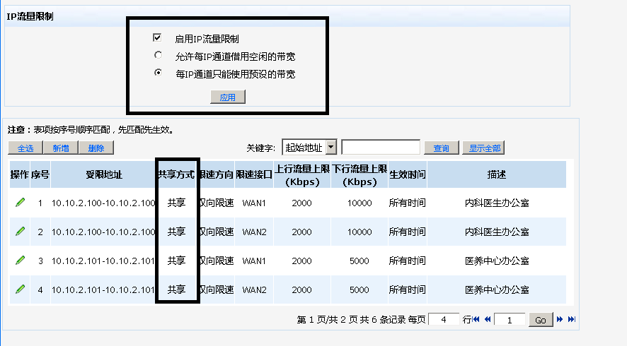 换个模式: 带宽共享方式 选择需要进行流量限制的计算机的带宽共享方式,当受限地址类型为IP地址范围时可选择独占或共享,为IP网段时,系统自动设定为共享,无法修改 · 独占:受限地址范围内的每台计算机各自占有给定的带宽(即流量上限),如IP地址范围为192.168.1.2~192.168.1.11,流量上限为3000Kbps,表示此IP范围内的每台计算机的流量上限为3000Kbps · 共享:受限地址范围内的所有计算机共享给定的带宽,如IP地址范围为192.168.1.2~192.168.1.11,流量上限为3000Kbps,表示此IP范围内的所有主机的流量之和的上限为3000Kbps