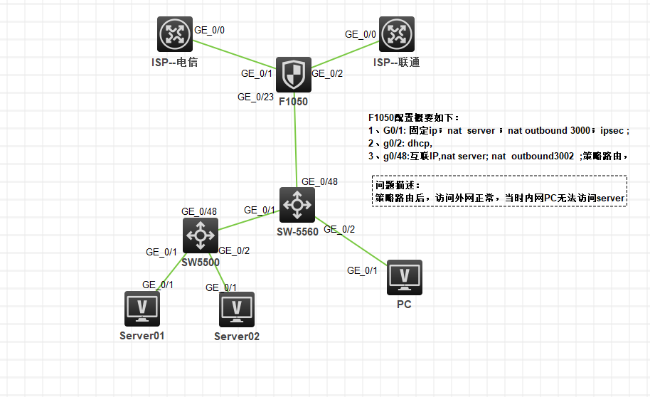 1、G0/1: 固定ip;nat server ;nat outbound 3000;ipsec ;
