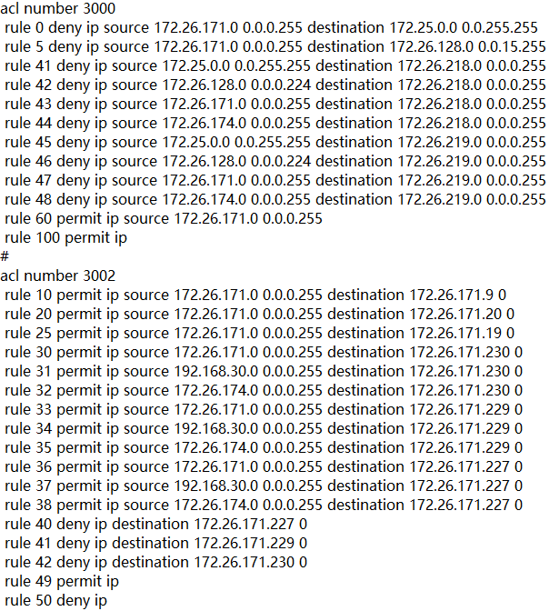 你好,策略路由访问外网的话是根据源地址进行匹配的,如果访问内网的话是根据目的地址进行匹配。试过了不行啊。 应用需求: 1、172.26.171.55/24 172.26.171.24/24 这2个地址访问外网做电信出口G0/1,对端地址(191.167.100.254); 2、其它172.26.171.0/24、172.26.174.0/24、192.168.30.0/24访问外网走联通G0/2,对端地址(209.33.33.59);’ 3、内网访问内网地址走G0/48,核心交换机地址10.1.1.2; 配置如下: ip policy-based-route neiwang node 5 permit: if-match acl 3600 apply next-hop 191.167.100.254 node 10 permit: if-match acl 3610 apply next-hop 209.33.3359 node 15 permit: if-match acl 3620 apply next-hop 10.1.1.2 ACL 3600 rule 0 permit ip source 172.26.171.55 0 rule 5 permit ip source 172.26.171.24 0 rule 10 deny ip ACL 3610 rule 0 deny ip source 172.26.171.55 0 rule 5 deny ip source 172.26.171.24 0 rule 10 permit ip ACL 3620 rule 0 permit ip destination 172.26.171.0 0.0.0.255 rule 5 permit ip destination 172.26.174.0 0.0.0.255 rule 10 permit ip destination 192.168.30.0 0.0.0.255