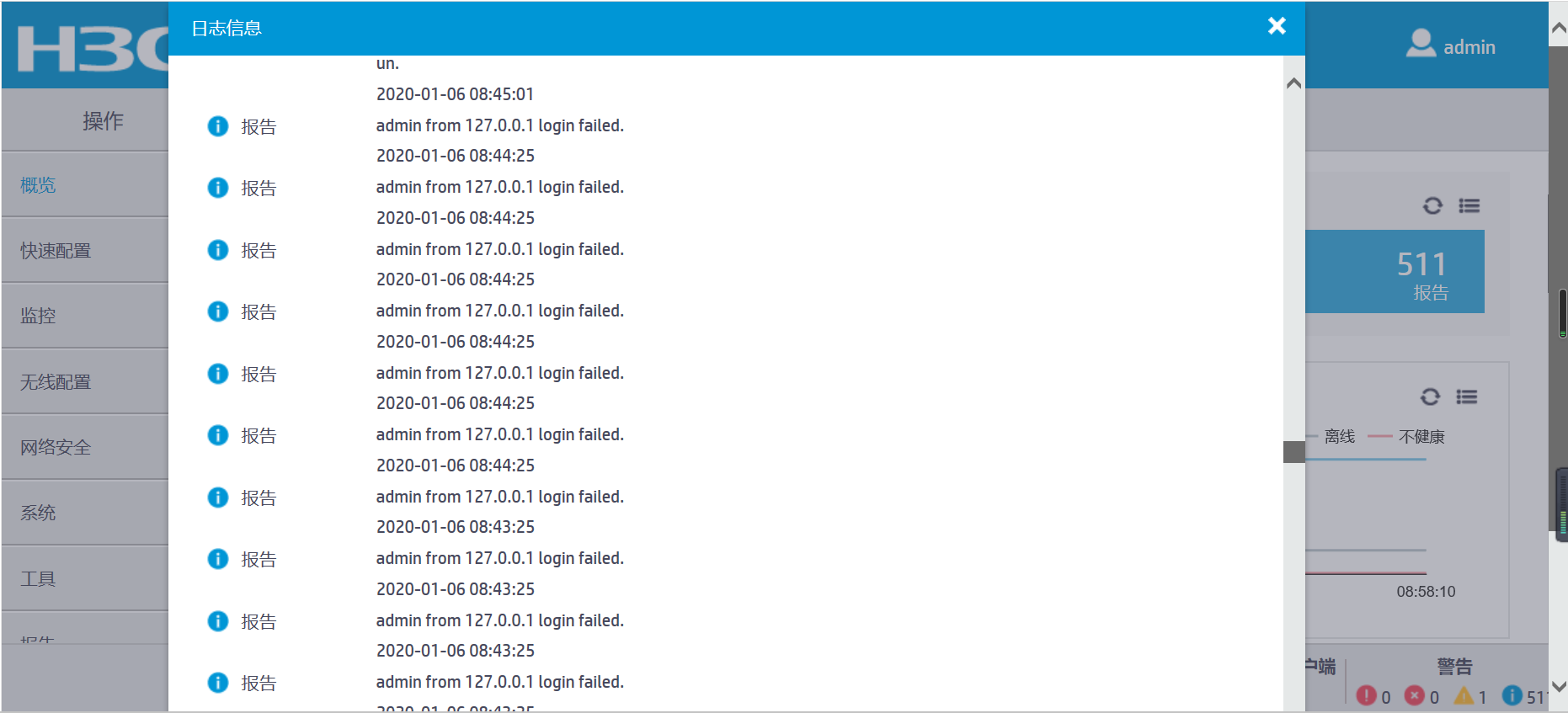 公司网络最近不稳,登录上AC控制器发现日志中有大量admin from 127.0.0.1 login failed.日志,隔几分钟就有7 8条这种信息,放假回来再查了下就半个小时全都是这种日志