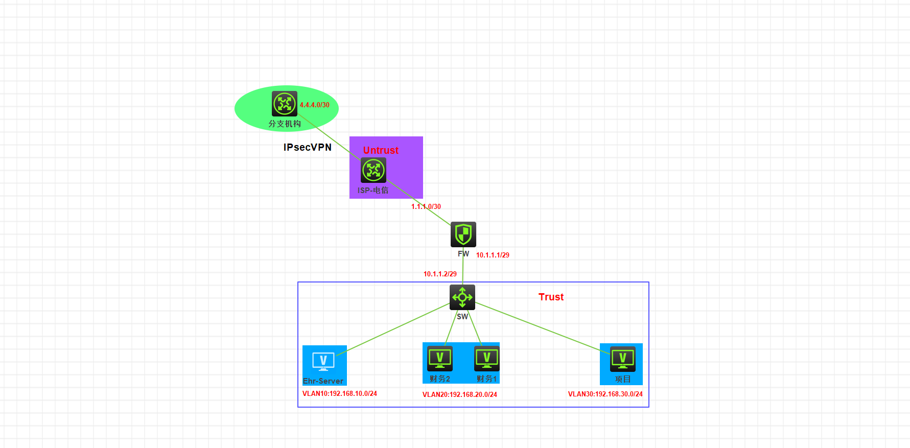 2、总部的大致为出口网关与核心交换机通过互联地址10.1.1.1与10.1.1.2连接