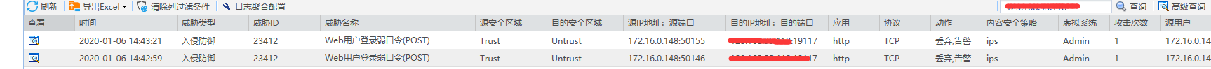 是这样的,客户用的是f100-s-g2防火墙,域间策略都是放通的,且都有IPS策略应用,现在反应需要访问一个网站,在内网访问不了,用热点可以访问,我查了查网站的IP地址,用这个地址在威胁日志了搜,搜出下面的结果,是表示登录这个网站密码太简单了所以才把数据包丢弃,不让访问的吗