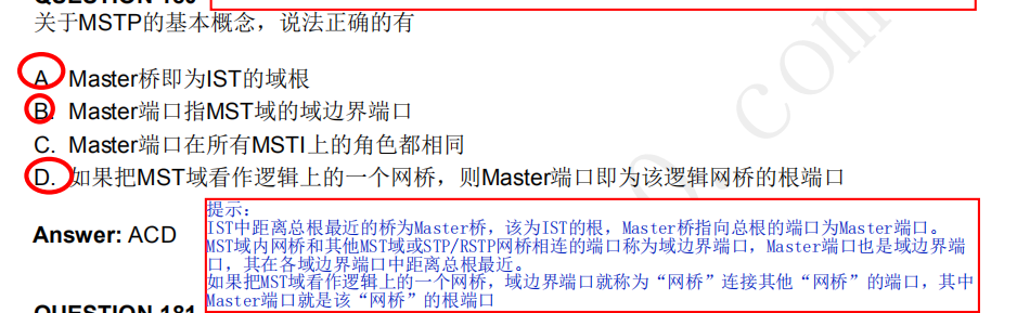 IST是MST域内的一棵生成树,它是一个特殊的MSTI,通常也称为MSTI 0,所有VLAN缺省都映射到MSTI 0上。
