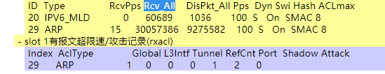设备对上送CPU的报文是有限制的,RCV-ALL代表设备收到的报文,DISPKT是丢弃的报文。ARP报文超限了,现网是不是有某些业务出现丢包情况了已经