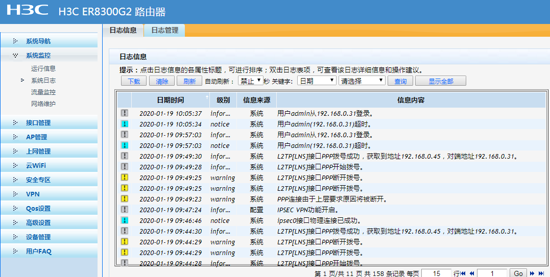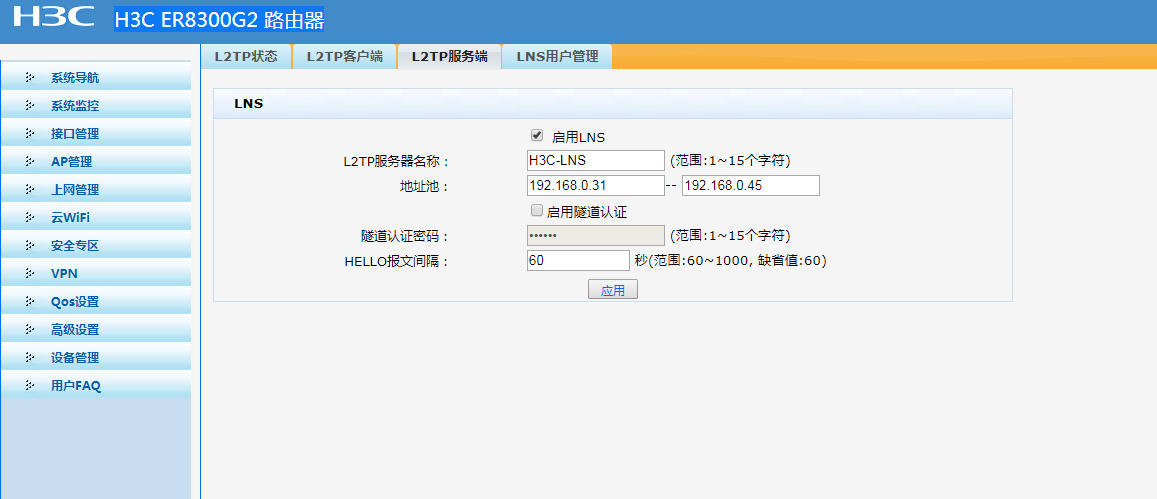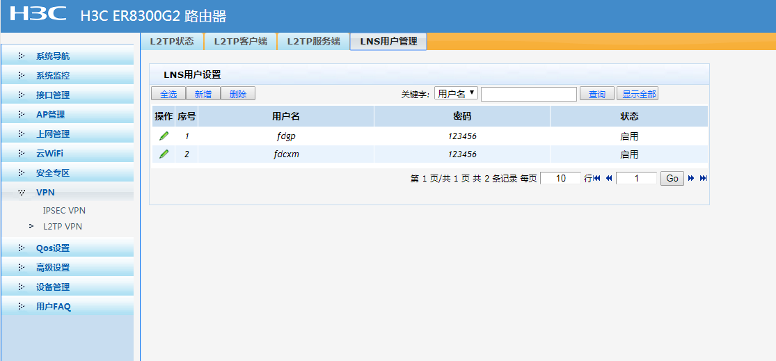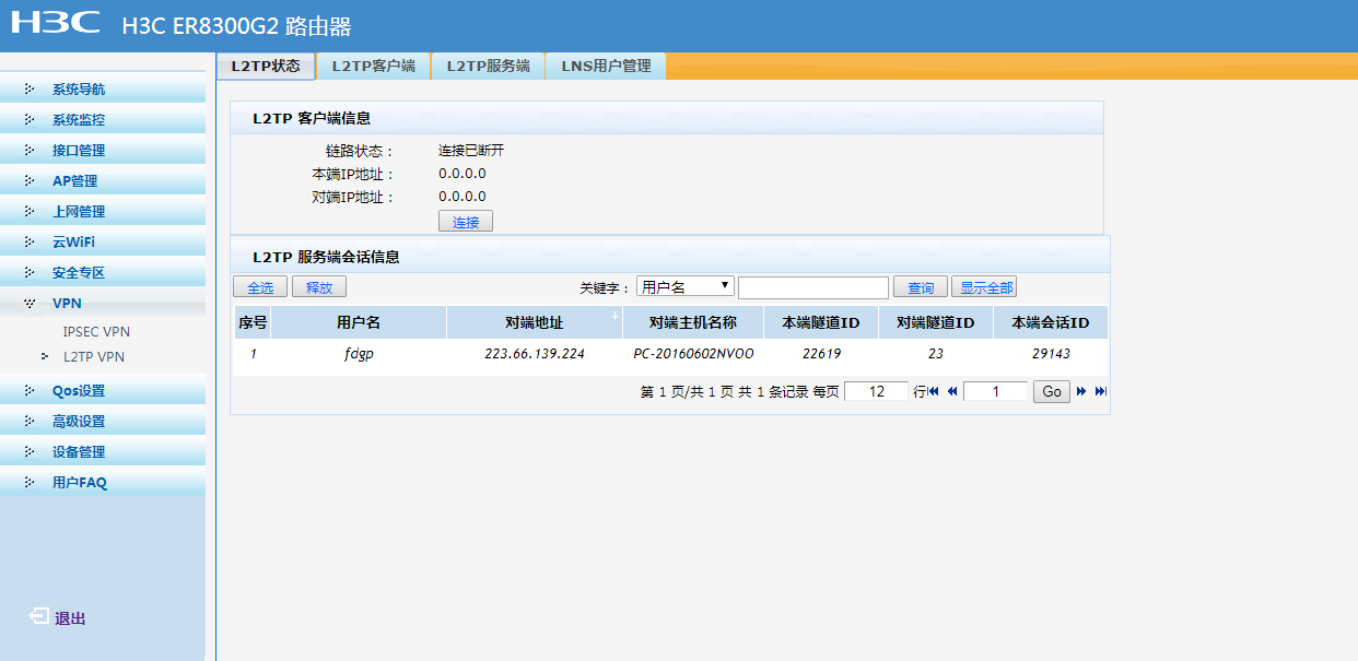 公司用的是H3C ER8300G2 路由器,配置了L2TP VPN,设置如下图