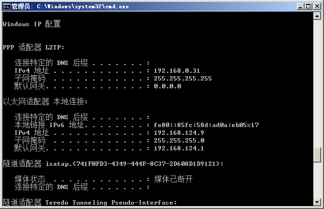 在家里用win7电脑,通过拨号VPN方式成功连接过去,获取的网络信息如下图