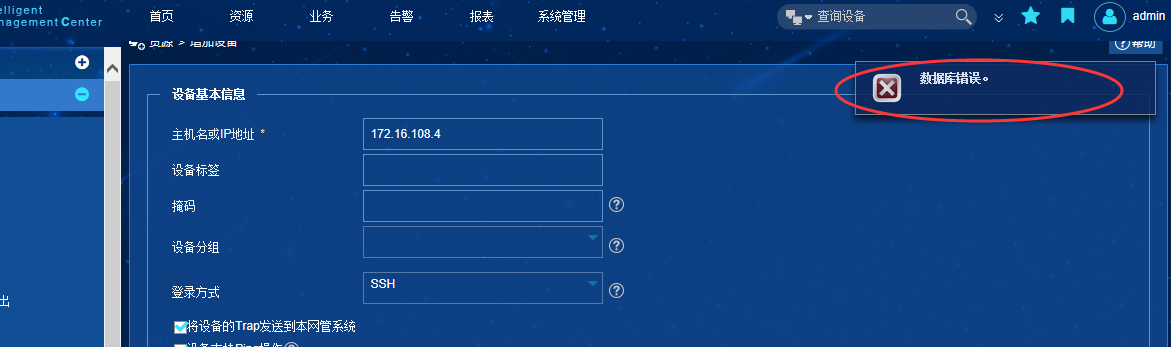 有一台网络设备添加到IMC中时报错:数据库错误。
