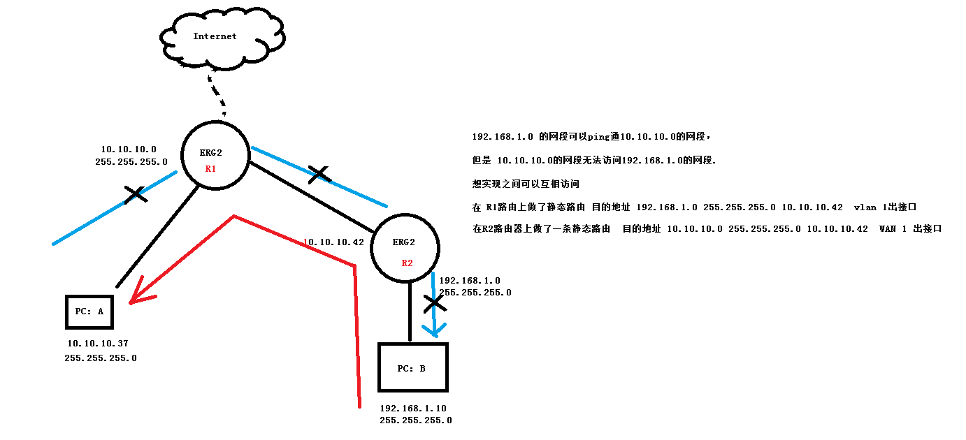 两台ER5200G2路由器,10.10.10.0网段的ER路由器下接了交换机,交换机下接了一台ER500G2路由器该网段 为192.168.1.0,想实现互相访问,求大神们支招- -