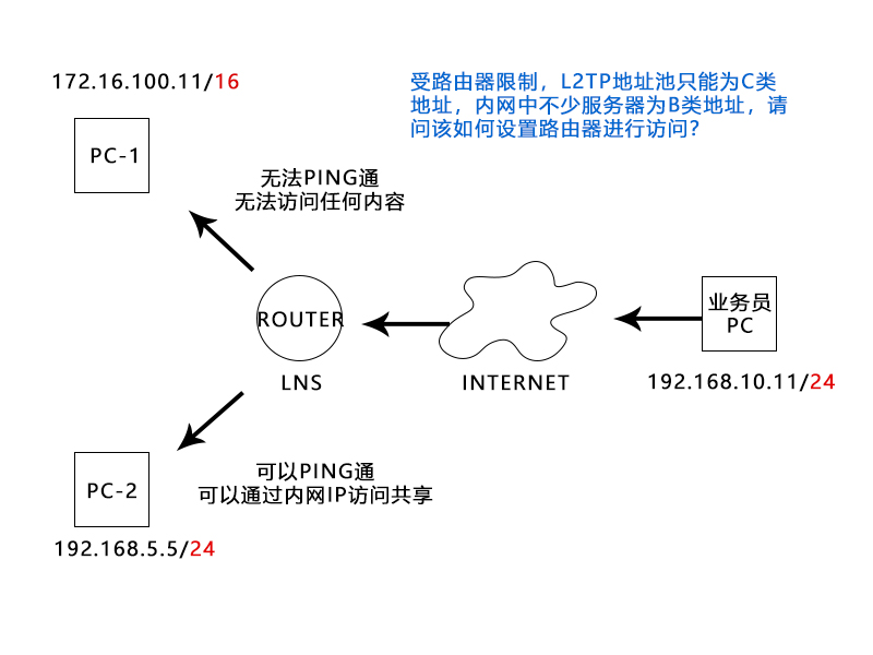 如图,公司只有一个VLAN,无三层交换,主路由ER5200G2配置的是B类地址,主路由做LNS,远端电脑L2tp连接成功后,只能访问内网手动配置的C类地址电脑,B类地址均无法访问。