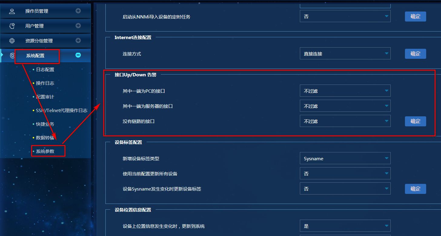 是交换机连接PC的接口UP/DOWN消息么?可以在【系统管理】-【系统配置】-【系统参数】中如下位置设置下。