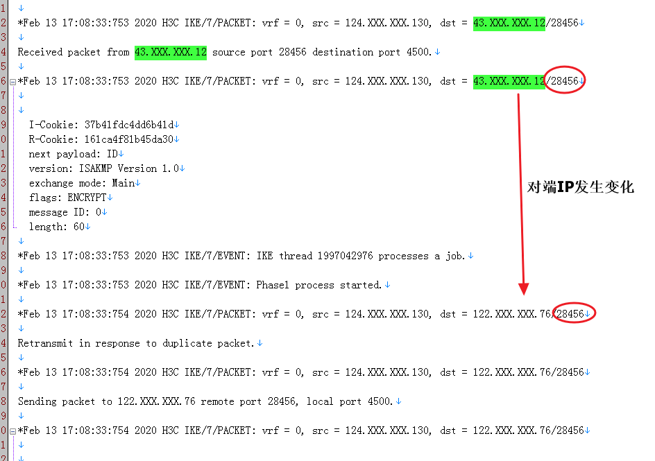 但在日志中对端公网IP主要变成了:122.XXX.XXX.76(见下图)