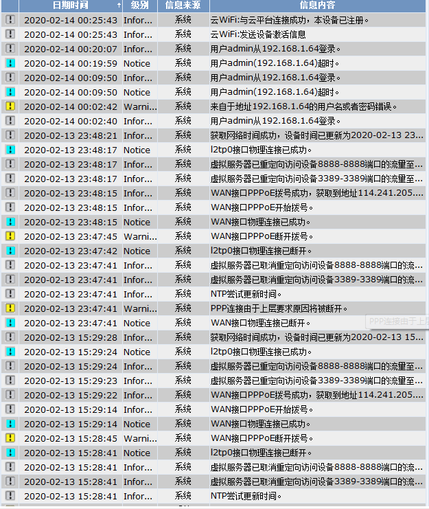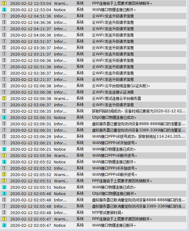上传三张日志截图,请大神帮忙看看是什么原因造成的。每天里面,隔几个小时,WAN口物理连接断开,再自动连接,如此反复,每天都这样。是光猫出问题了嘛?还是WAN口的水晶头或者是网线有问题?怎么解决这个问题。