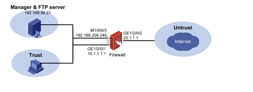 如果防火墙到FTP中间还有一台路由器,那么路由器和防火墙的互联,防火墙的接口要加入安全域,然后放通域间策略,最后再配置静态路由指向到FTP所在的网段,下一跳地址是路由器互联的地址;而路由器也配置静态路由指向到防火墙,下一跳地址是防火墙接口的地址。