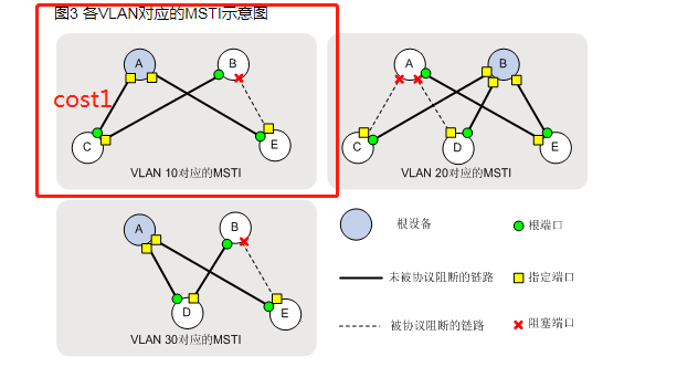 图中是MSTP配置,无法理解B至E端口选举指定还是堵塞问题
