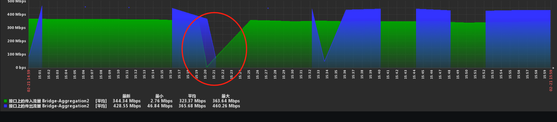 蓝色为端口流出流量,绿色为流入流量
