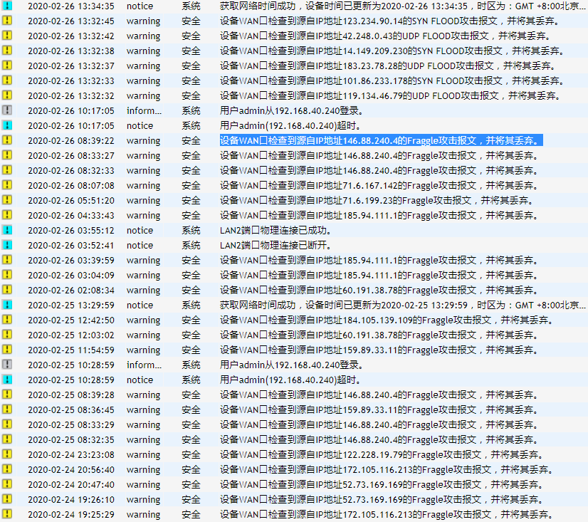 请问这个是什么问题导致,以及解决方法;(设备WAN口检查到源自IP地址146.88.240.4的Fraggle攻击报文,并将其丢弃。)