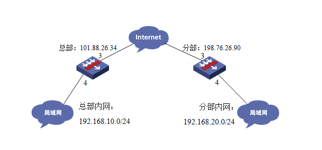1.网络架构如图所示,如果想通过租用电信的线路(像公安那种),不是通过运行商固定的ip地址实现两地互访,这个应该如何配置?