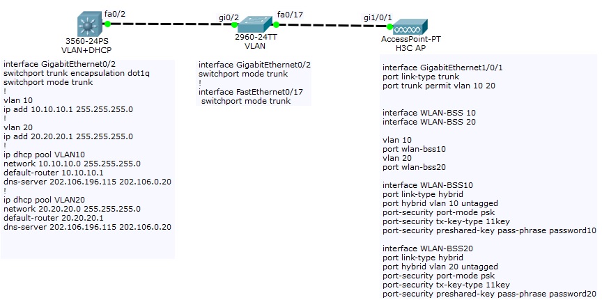 谢谢您,我在这里无法上图。自己用模拟器做了一个示意图,不知道您能否看到。在下面编辑里有显示。您看如此配置,是否正确。我感觉还缺少SSID的定义,但还没有搞清楚VLAN、BSS、SSID三者对应关系和命令顺序。
