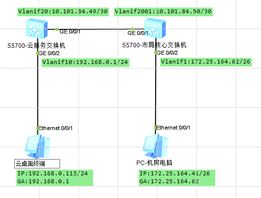 对端是云服务交换机,静态路由:ip route-static 172.25.164.0 255.255.255.192 10.101.84.50