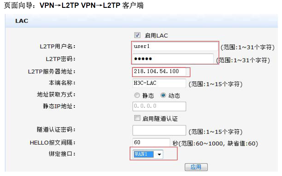 配置LNS信息(启用LNS,输入L2TP服务器名称:H3C-LNS,地址池:10.10.11.10~10.10.11.20,单击<应用>按钮生效) | |