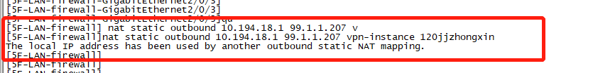 现在有一条专线我配置ip地址为99.1.1.207.请问我可以用静态一对一装换吗,就转换出接口ip。还有如果加vpn实例为什么出现图片打印错误提示
