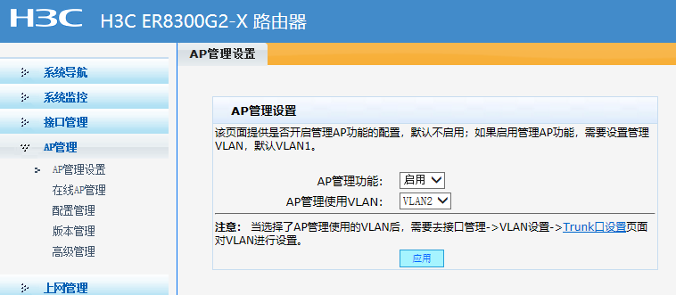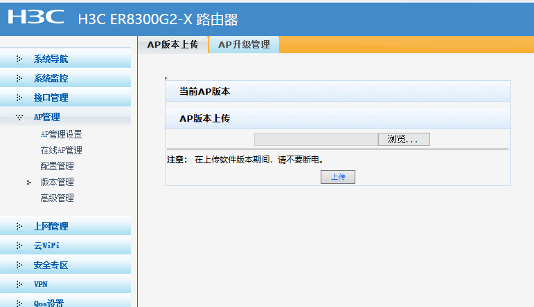 各位大神,本人有一台ER8300G2-X的路游戏,想用其AP管理功能,于是买了一个H3C Mini A61-E的AP。接上电源网线,手机连接可以上网,IP网段与路由器中VLAN1是同一网段。但路由器中“AP管理”的“在线AP管理”无法显示,考虑到可能版本不一致,本人查看“版本管理”,里面“当前AP版本”下无任何显示,如图: